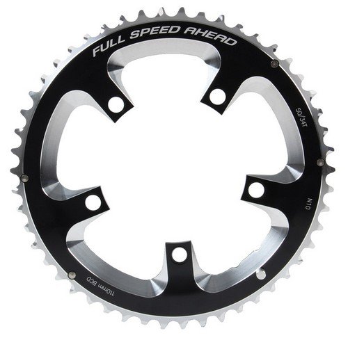 FSA Super Road Chainring. CNC Machined AL7075-T6 Laser-etched logosSome are designed to work in specific tooth combinations; parentheses indicate appropriate mating ringShifting ramps and Stainless steel pins on middle and outer ringsS10 is compatible with Shimano, SRAM and Campagnolo Ultra Narrow 10-SpeedS9/C10 is compatible with Shimano 9 speed and Campagnolo C10 10-SpeedItem SpecificationsColorBlackMaterial7075-T6Teeth50teethBolt Pattern5-BoltChainring BCD110mmPositionOuterChain CompatibilityShim/SRAM 10
